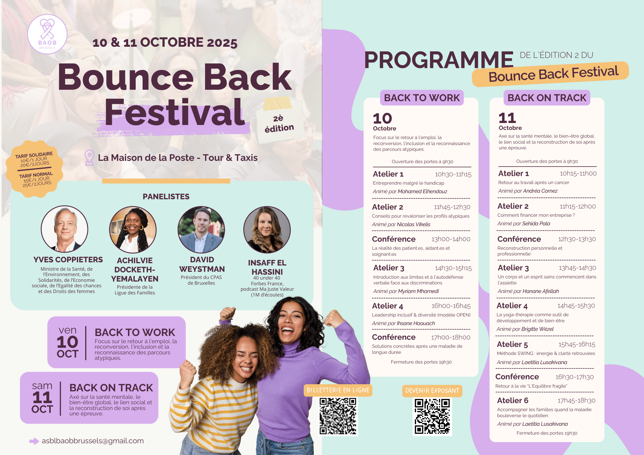 âRĂ©mission et rĂ©insertion profesionnelle : quand la fin des traitements n'est que le dĂ©but sur MediQuality âMieux rebondir aprĂšs une maladie de longue durĂ©e sur le site de la Fondation Roi Baudouin âBounce Back Festival sur le site de la Ville de Bruxelles